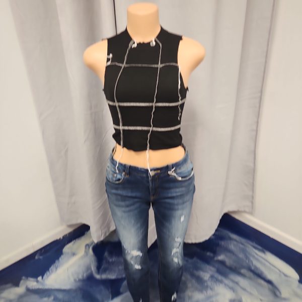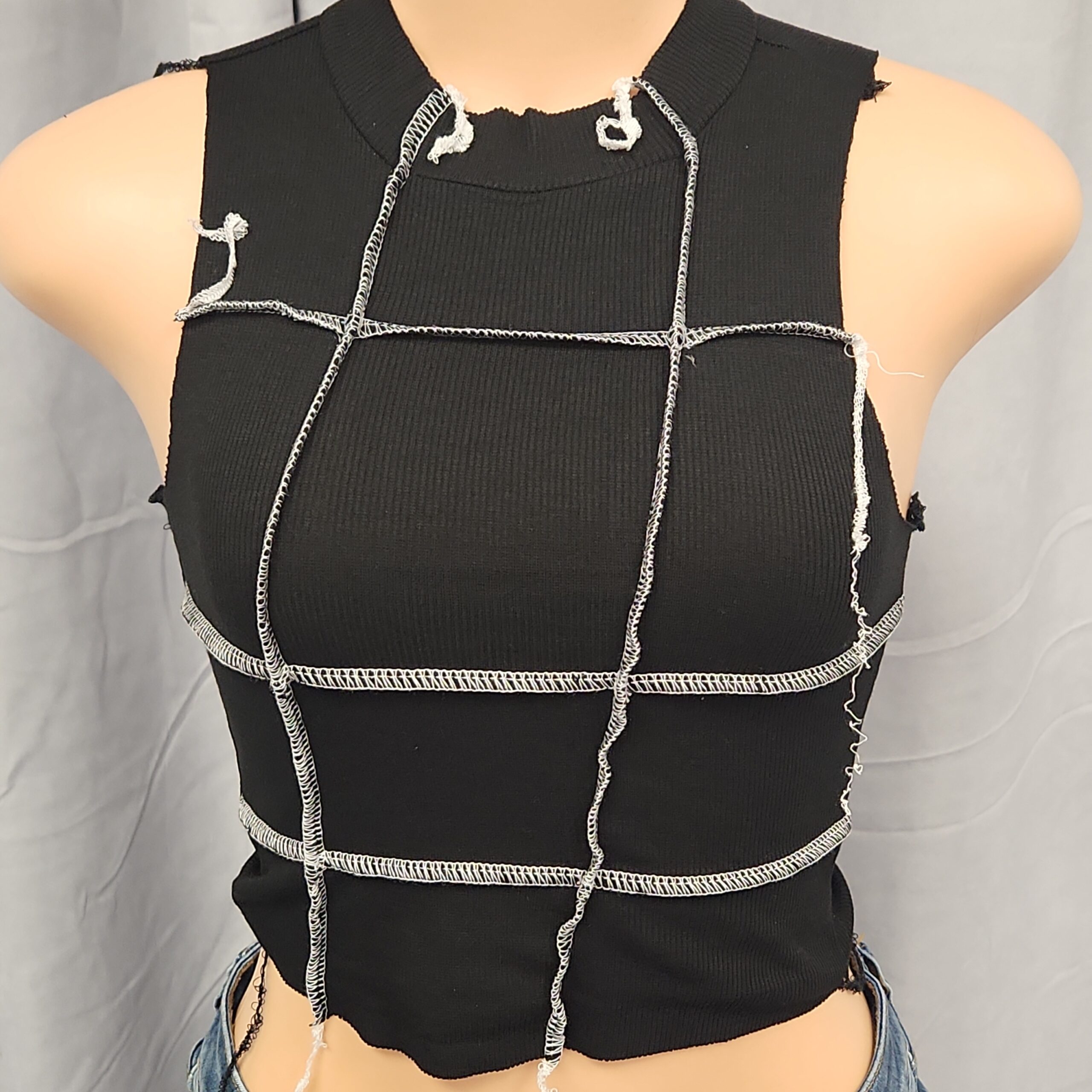 The Black with white stitch Bodi stitch tank top sleeve cut off is a stylish and versatile piece of clothing that combines comfort and fashion. This tank top is designed with a black base color and features white stitching details, adding a touch of contrast and visual interest to the overall design