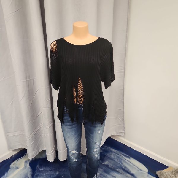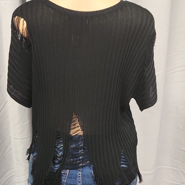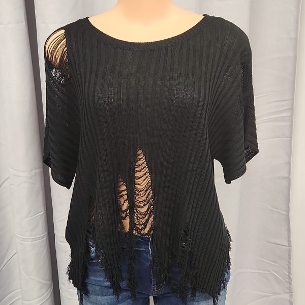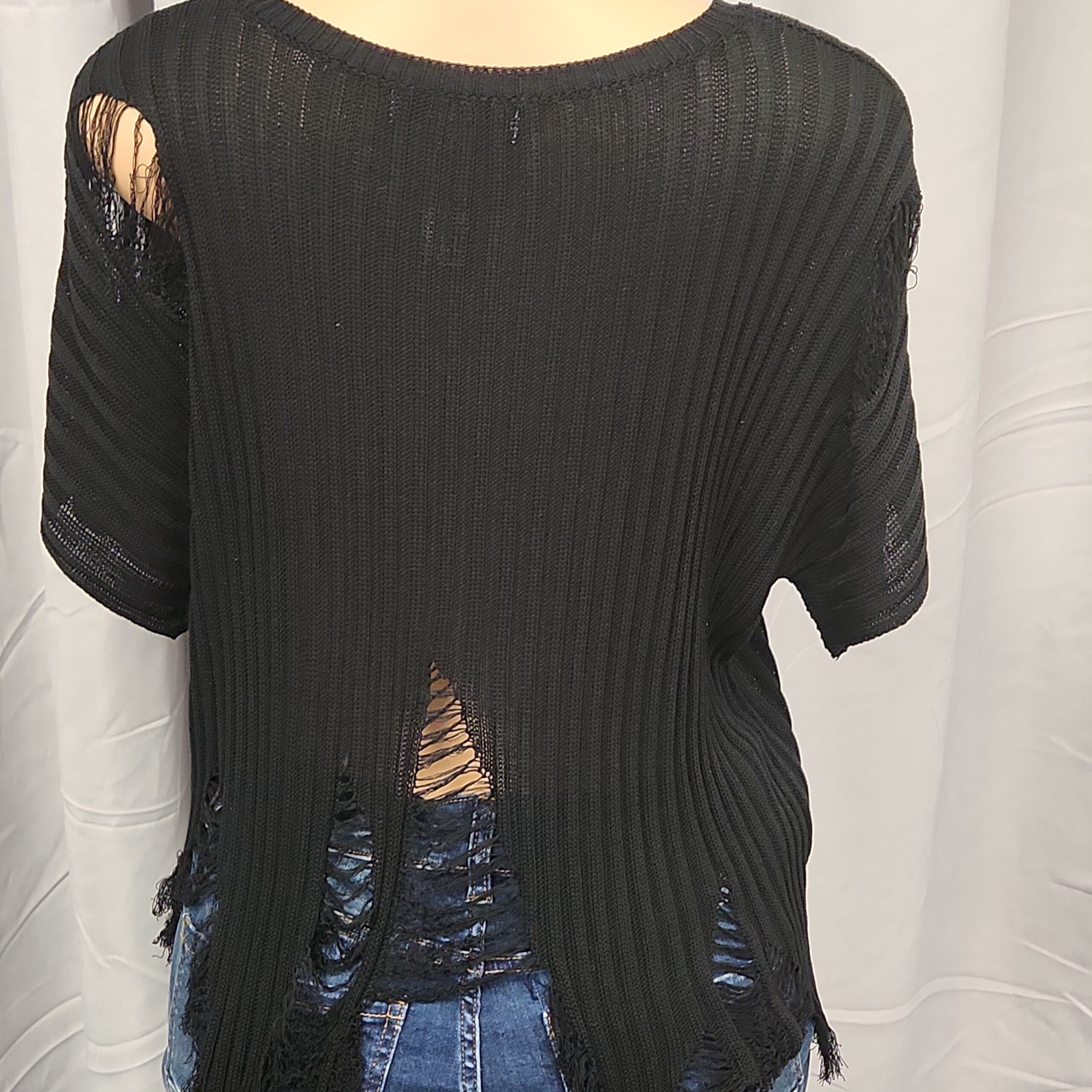 The Wide Scoop Short Sleeve Distressed Sweater is a stylish and versatile garment that combines comfort and fashion. This sweater is designed to flatter the figure and provide a trendy look for any occasion.