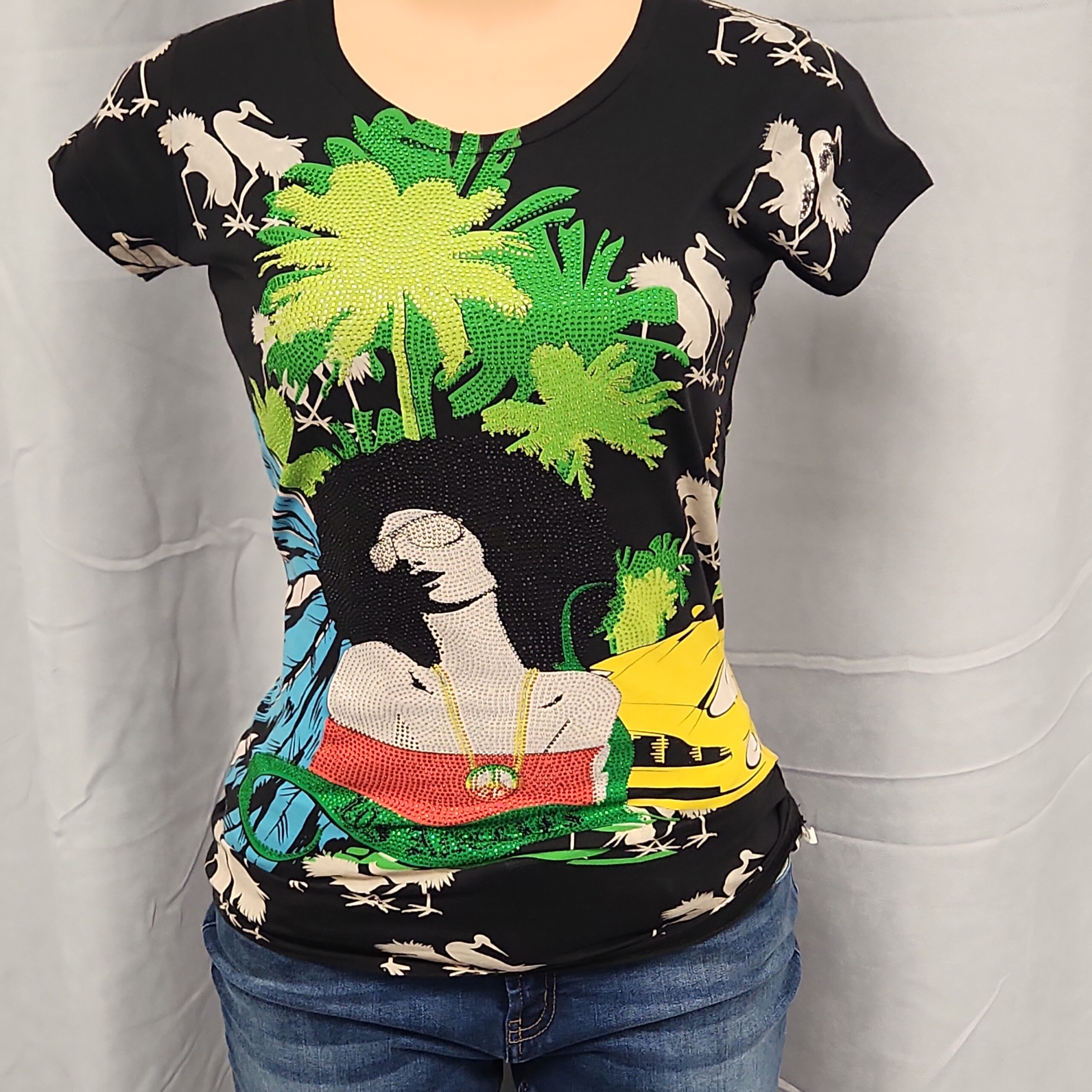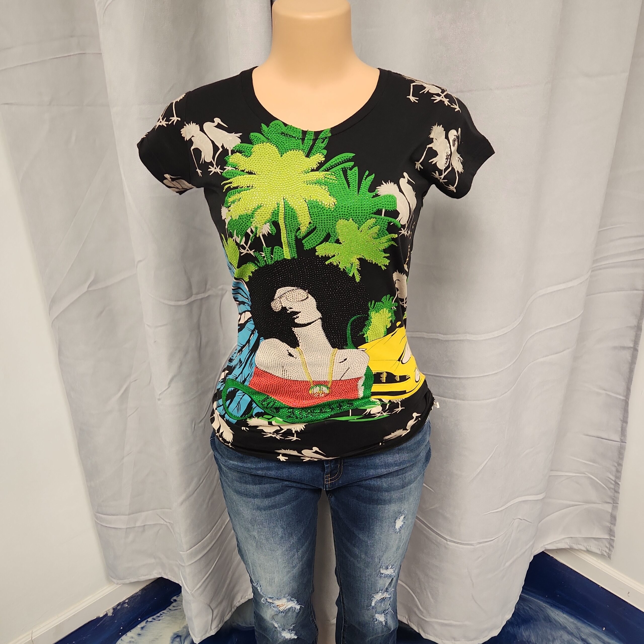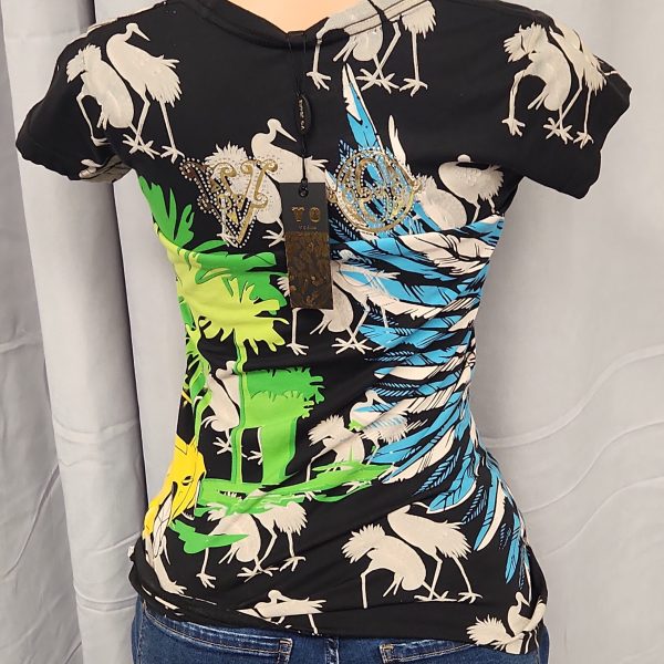 The Multicolored tshirt VO jean tropical woman print is a vibrant and stylish piece of clothing that combines comfort, fashion, and a touch of tropical flair. This t-shirt is designed specifically for women who want to make a bold fashion statement while embracing the beauty of nature.