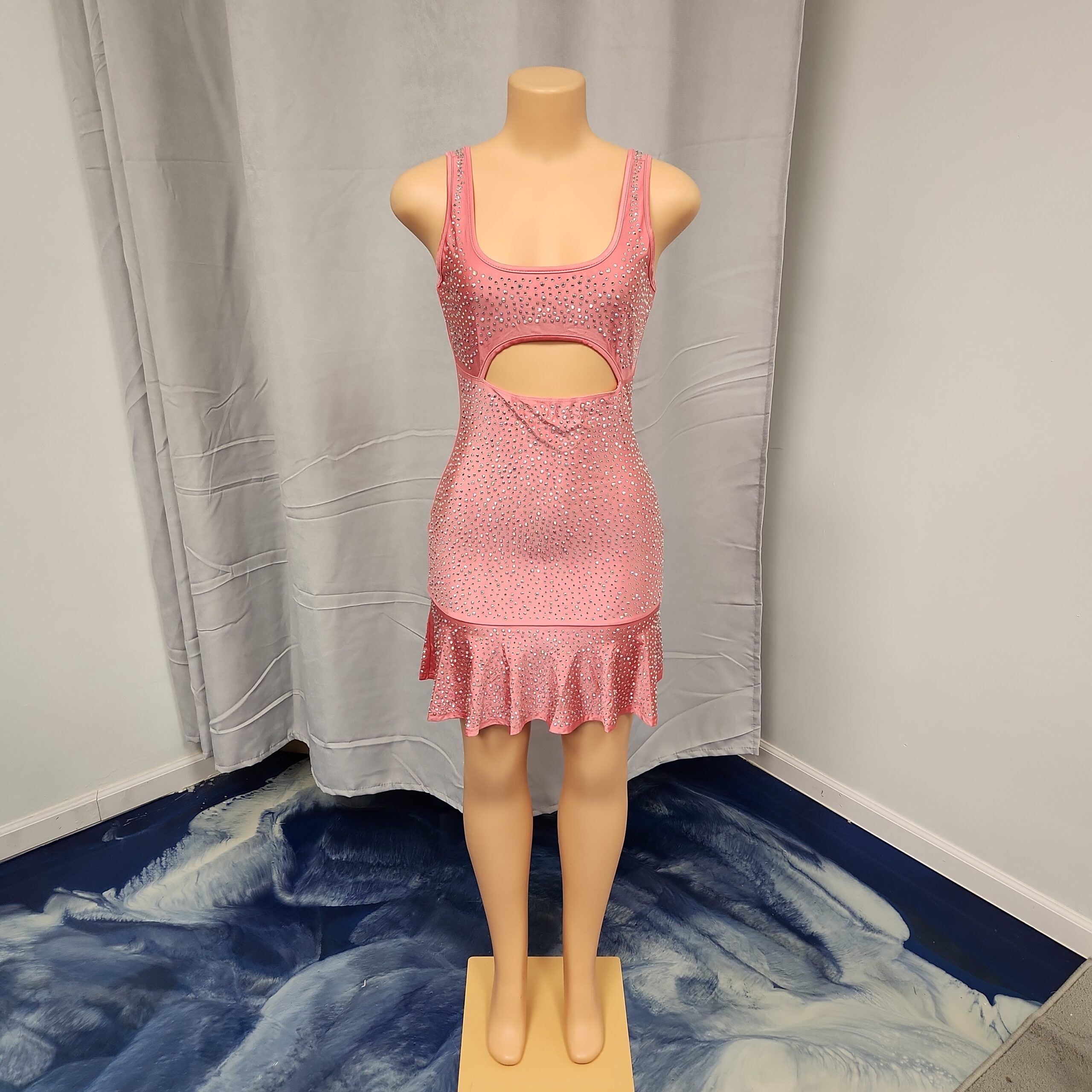 The pink dress with crystal detail features a stunning cut-out design in the front, adding a touch of elegance and glamour to any occasion.