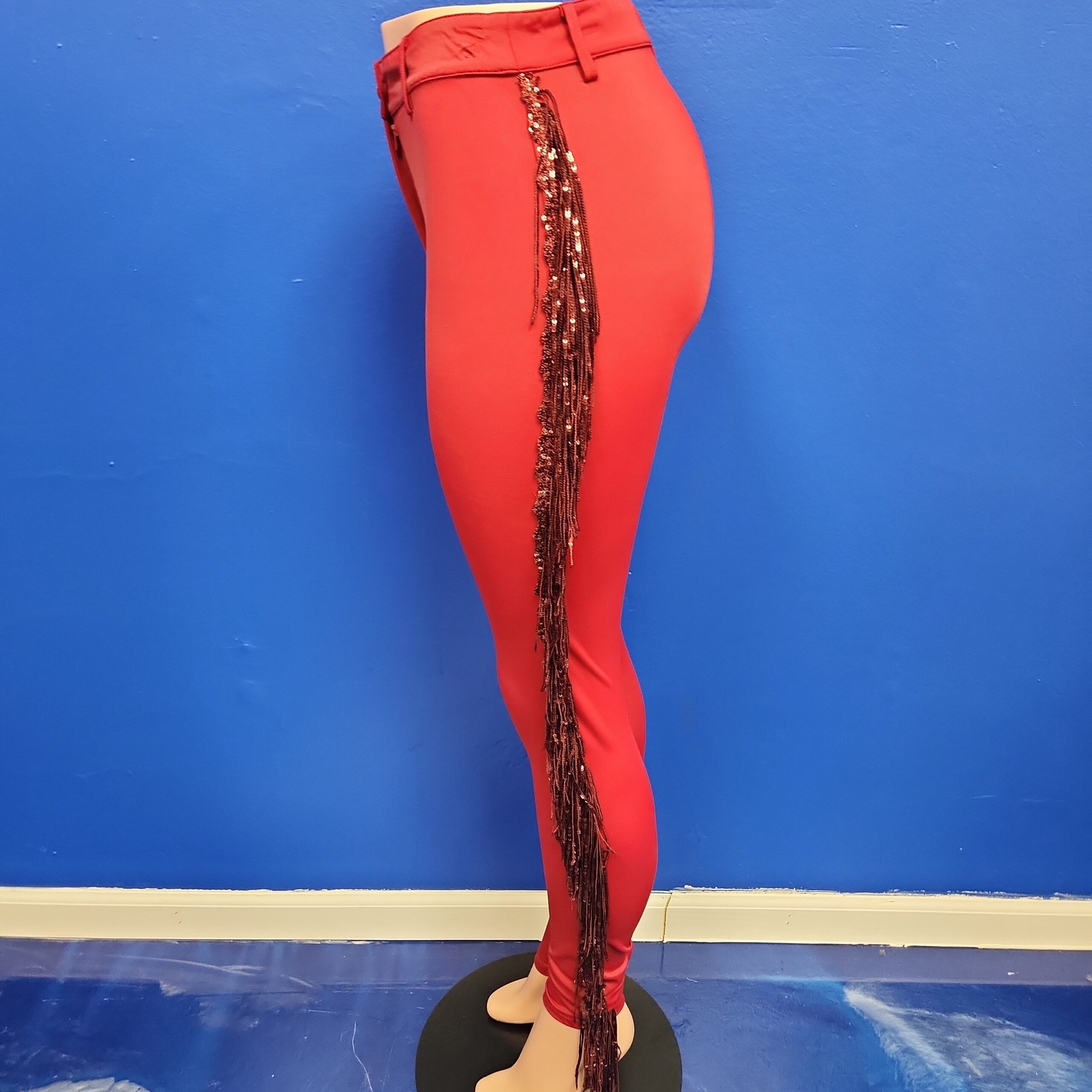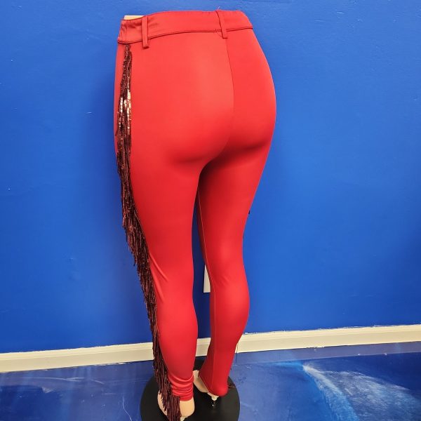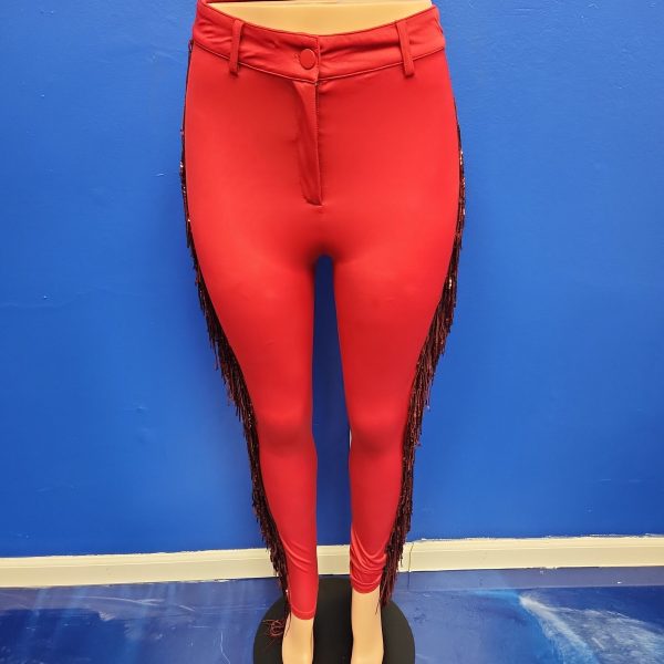 The red pants with darker red fringes down the sides are a stylish and eye-catching addition to any wardrobe. Made from high-quality materials, these pants offer a comfortable fit and a unique design that sets them apart from ordinary pants. The vibrant red color adds a bold and confident touch to any outfit, while the darker red fringes down the sides add a touch of elegance and sophistication.