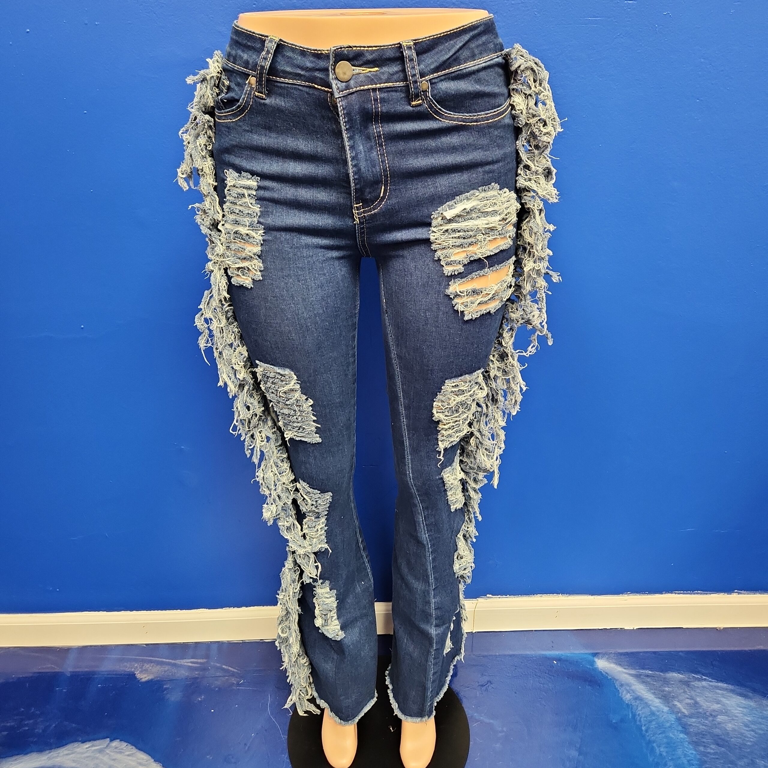 The Ripped Side jeans feature flared sides and distressed detailing, adding a trendy and edgy touch to your outfit. These jeans are perfect for those who want to make a bold fashion statement. The ripped side design adds a unique and eye-catching element, while the flared sides create a flattering silhouette.