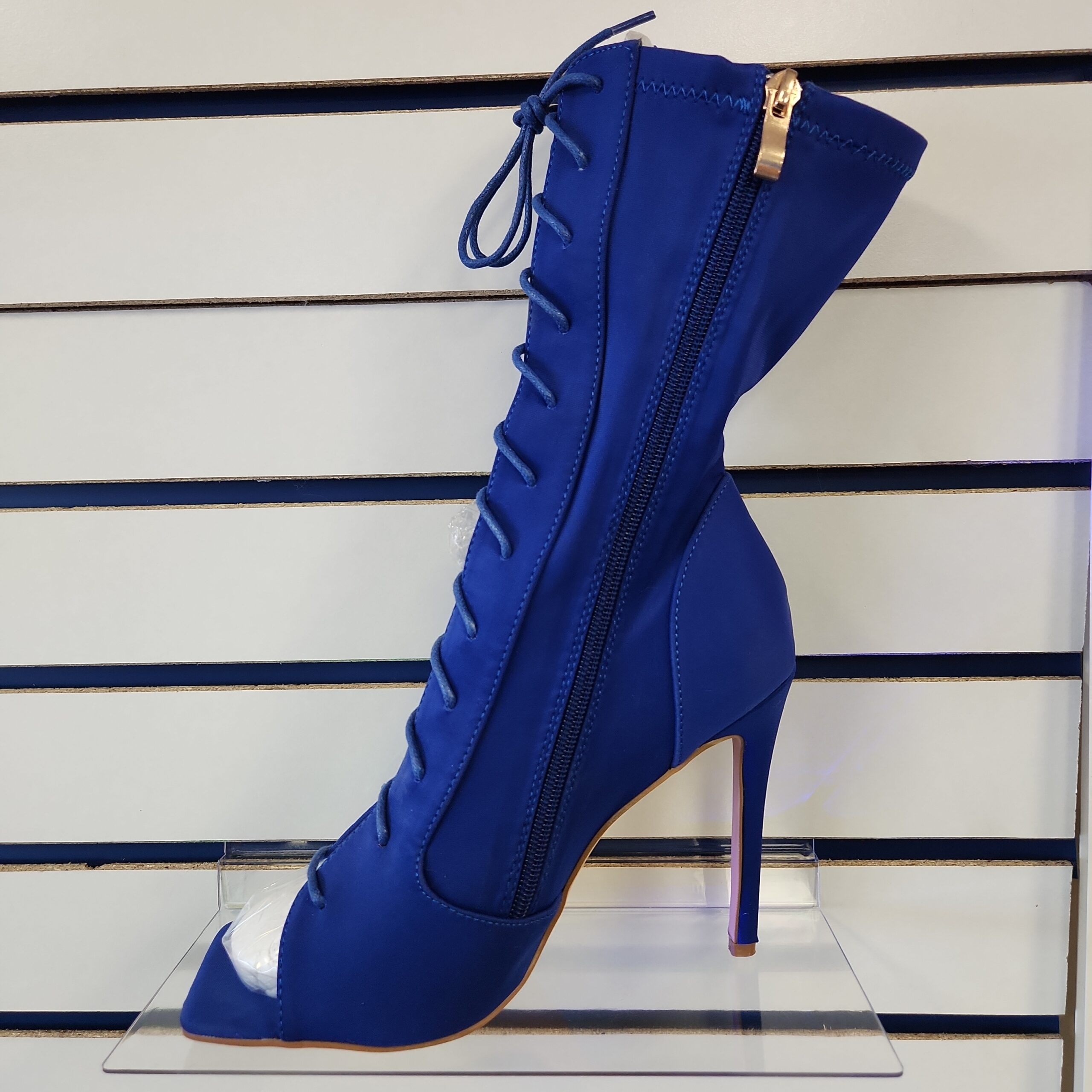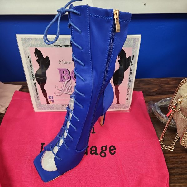 Royal Blue Lace up Bootie peep toe high heels are a stylish and trendy footwear option. They feature a vibrant royal blue color, lace-up design, and a peep toe opening. The high heel adds height and elegance to the overall look.