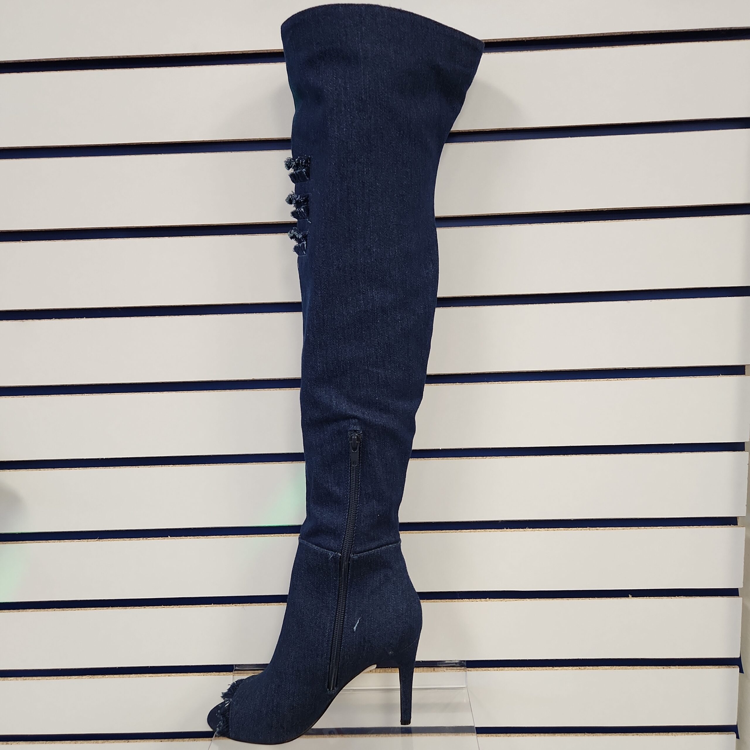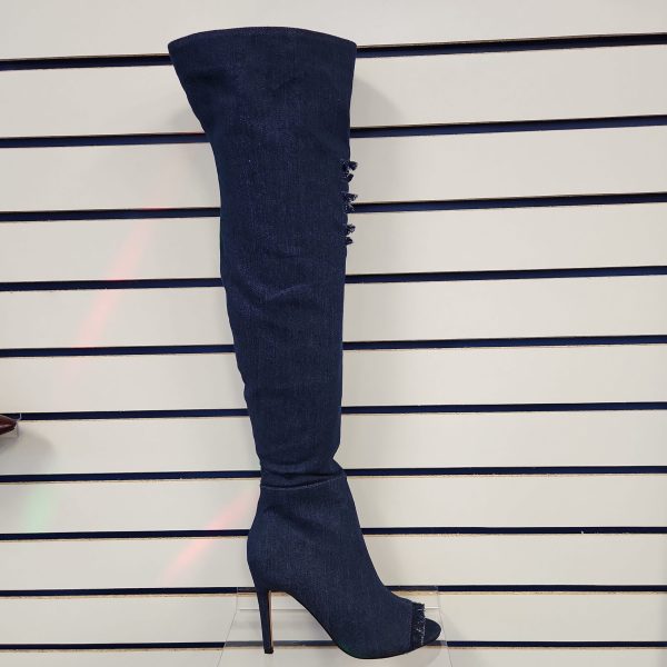 The Tall denim peep toe boot is a stylish and trendy footwear option that combines the classic appeal of denim with the modern design of a thigh-high boot. With its open toe and stiletto heel, this boot offers a unique and fashionable twist to the traditional knee-high style. The tall length of the boot elongates the legs, creating a flattering and eye-catching look. Made from high-quality denim material, these boots are durable and comfortable to wear.