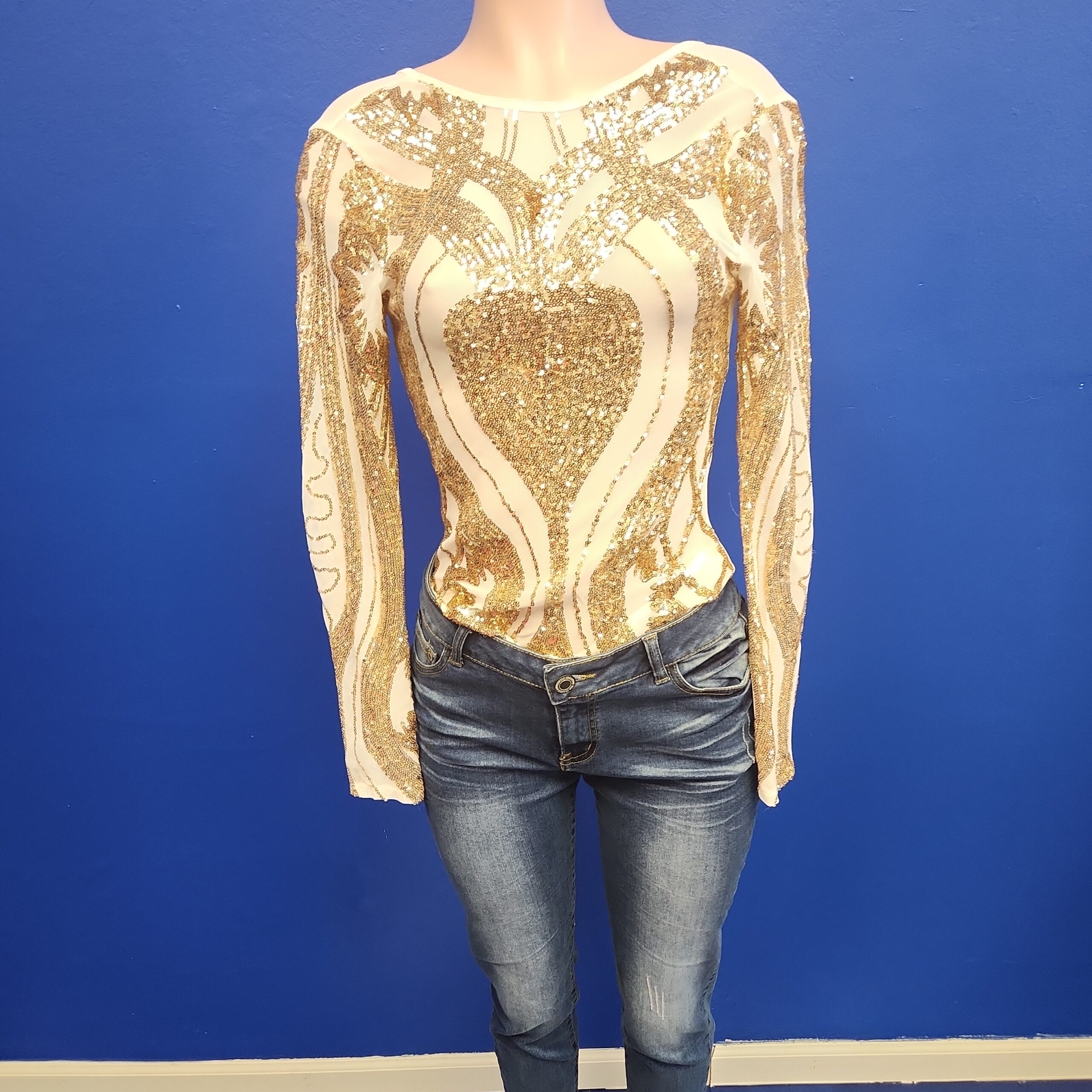 The white with gold sequin bodysuit is a stunning and glamorous piece of clothing that features a white base color adorned with shimmering gold sequins. It is designed to fit snugly against the body, accentuating curves and creating a sleek and stylish look. The combination of white and gold adds an elegant touch to any outfit, making it perfect for special occasions or nights out.