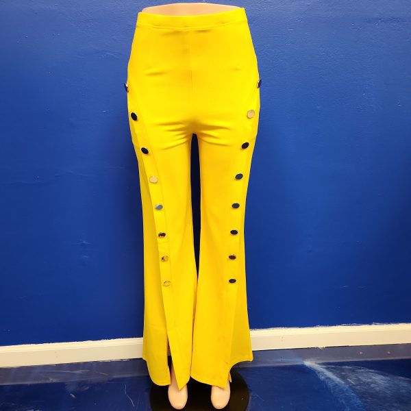 lntroducing our vibrant and stylish yellow pants with buttons going down the front of both legs. These pants are designed to make a bold fashion statement while providing comfort and versatility. Crafted from high-quality materials, these pants are not only visually appealing but also durable and long-lasting.